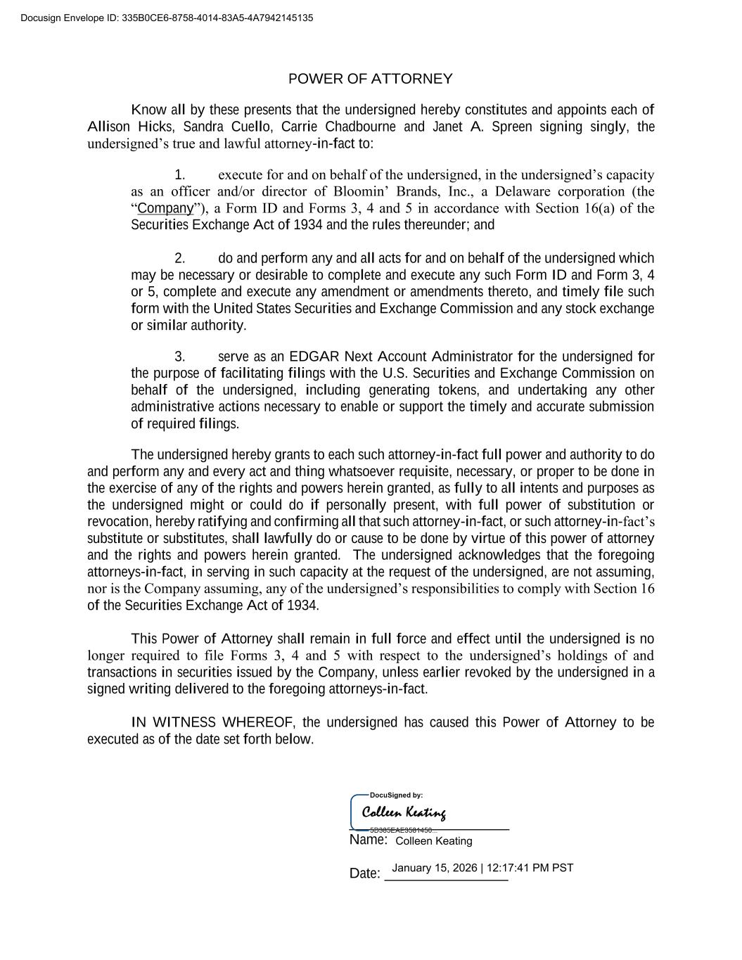 POWER OF ATTORNEY Know all by these presents that the undersigned hereby constitutes and appoints each of Allison Hicks, Sandra Cuello, Carrie Chadbourne and Janet A. Spreen signing singly, the undersigned’s true and lawful attorney-in-fact to: 1. execute for and on behalf of the undersigned, in the undersigned’s capacity as an officer and/or director of Bloomin’ Brands, Inc., a Delaware corporation (the “Company”), a Form ID and Forms 3, 4 and 5 in accordance with Section 16(a) of the Securities Exchange Act of 1934 and the rules thereunder; and 2. do and perform any and all acts for and on behalf of the undersigned which may be necessary or desirable to complete and execute any such Form ID and Form 3, 4 or 5, complete and execute any amendment or amendments thereto, and timely file such form with the United States Securities and Exchange Commission and any stock exchange or similar authority. 3. serve as an EDGAR Next Account Administrator for the undersigned for the purpose of facilitating filings with the U.S. Securities and Exchange Commission on behalf of the undersigned, including generating tokens, and undertaking any other administrative actions necessary to enable or support the timely and accurate submission of required filings. The undersigned hereby grants to each such attorney-in-fact full power and authority to do and perform any and every act and thing whatsoever requisite, necessary, or proper to be done in the exercise of any of the rights and powers herein granted, as fully to all intents and purposes as the undersigned might or could do if personally present, with full power of substitution or revocation, hereby ratifying and confirming all that such attorney-in-fact, or such attorney-in-fact’s substitute or substitutes, shall lawfully do or cause to be done by virtue of this power of attorney and the rights and powers herein granted. The undersigned acknowledges that the foregoing attorneys-in-fact, in serving in such capacity at the request of the undersigned, are not assuming, nor is the Company assuming, any of the undersigned’s responsibilities to comply with Section 16 of the Securities Exchange Act of 1934. This Power of Attorney shall remain in full force and effect until the undersigned is no longer required to file Forms 3, 4 and 5 with respect to the undersigned’s holdings of and transactions in securities issued by the Company, unless earlier revoked by the undersigned in a signed writing delivered to the foregoing attorneys-in-fact. IN WITNESS WHEREOF, the undersigned has caused this Power of Attorney to be executed as of the date set forth below. ______________________ Name: Date: _________________ Docusign Envelope ID: 335B0CE6-8758-4014-83A5-4A7942145135 January 15, 2026 | 12:17:41 PM PST Colleen Keating